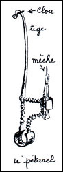 lampe à huile ou lampe romaine : Une mèche de filasse (1) incandescente baignant dans l'huile de chanvre répandait la clarté. Son principe de fonctionnement est défini par cette devinette : "Qui es ? Beu soun sang et manjo sus tripos". Réponse : la lampe. En effet, cette lampe métallique comprenait un réservoir en forme de coeur allongé ferrmé par un couvercle à charnière (le tampadou). La mèche émergeait à l'extrémité du bec. On l'allumait avec un luquet (2). Cette lampe à queue appelée "couéto del lum" se pendait au mur par un crochet (le gafet). |